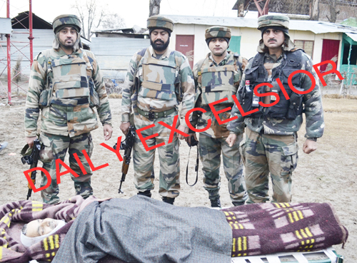 SOPORE: An army soldiers stand near the killed Mohd shafi sheikh of Zaloora sopore a top commander of Hizb-ul-Mujahideen out fit who was killed in an a gunfight with security forces in Seloo Sopore town north Kashmir’s Baramulla district on Sunday early morning . Excelsior/ Aabid Nabi