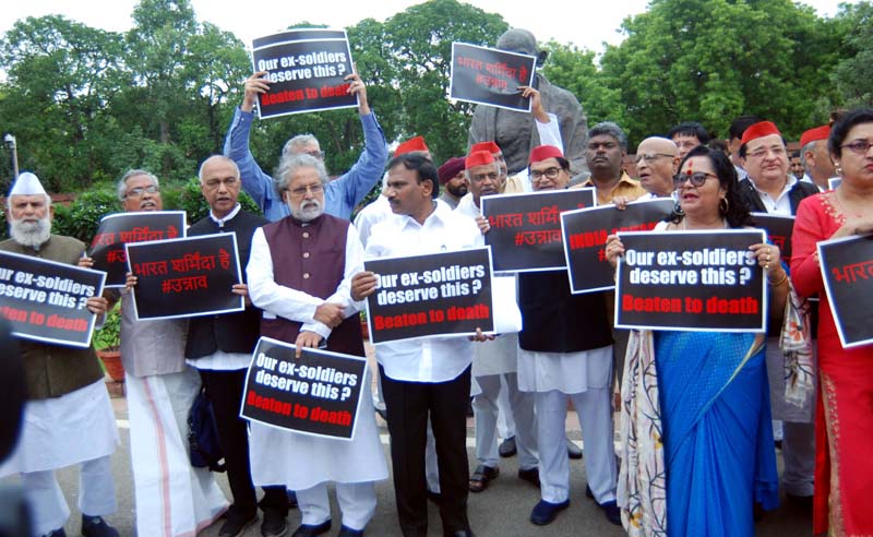 Opposition MPs of Samajwadi Party, DMK and TMC holding a demonstration in protest against the allegedly deteriorating law and order in Uttar Pradesh after recent incidents of a road accident of Unnao rape victim and the killing of an ex-serviceman, in front of Mahatma Gandhi Statue at Parliament house premises in New Delhi on Tuesday. (UNI)