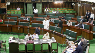 Opposition benches lying empty as Congress MLA GM Saroori speaks on the Grants of Law, Revenue and other departments in the Assembly on Sunday.—Excelsior/Rakesh