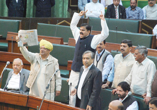 Opposition MLAs from Jammu protesting in Legislative Assembly on Friday.
