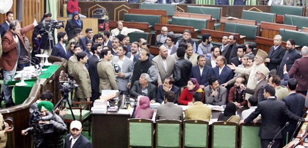 Opposition MLAs protesting in the Well of House as Speaker Kavinder Gupta is seen trying to persuade them on Wednesday. —Excelsior/Rakesh