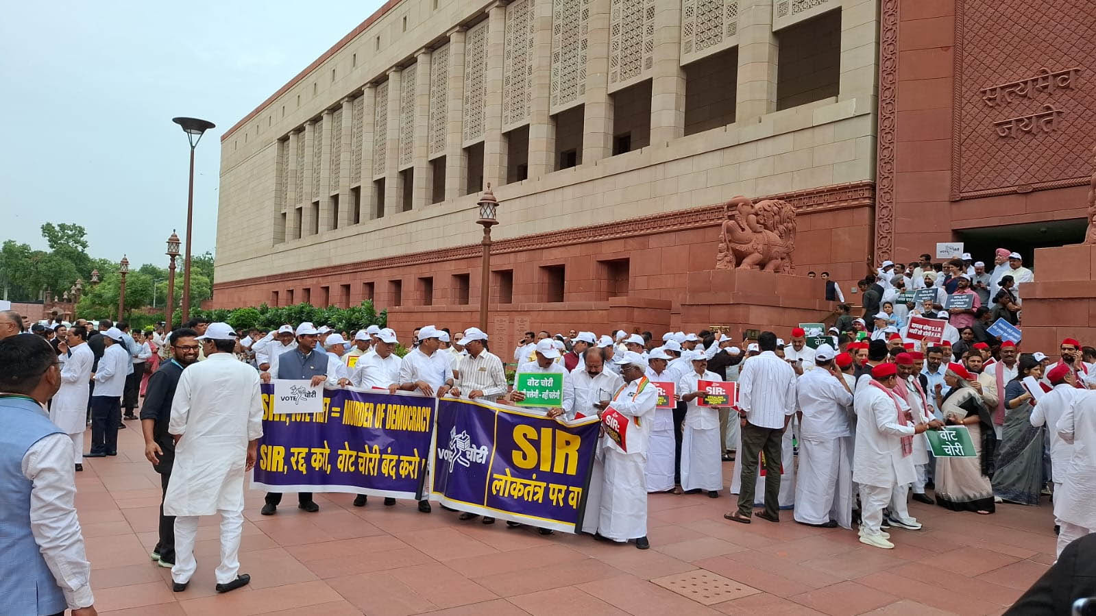 Wearing white caps with a red cross on the words ‘SIR’ and “vote chori”, the protesting MPs raised slogans against the Special Intensive Revision (SIR) exercise in Bihar while carrying placards and banners.