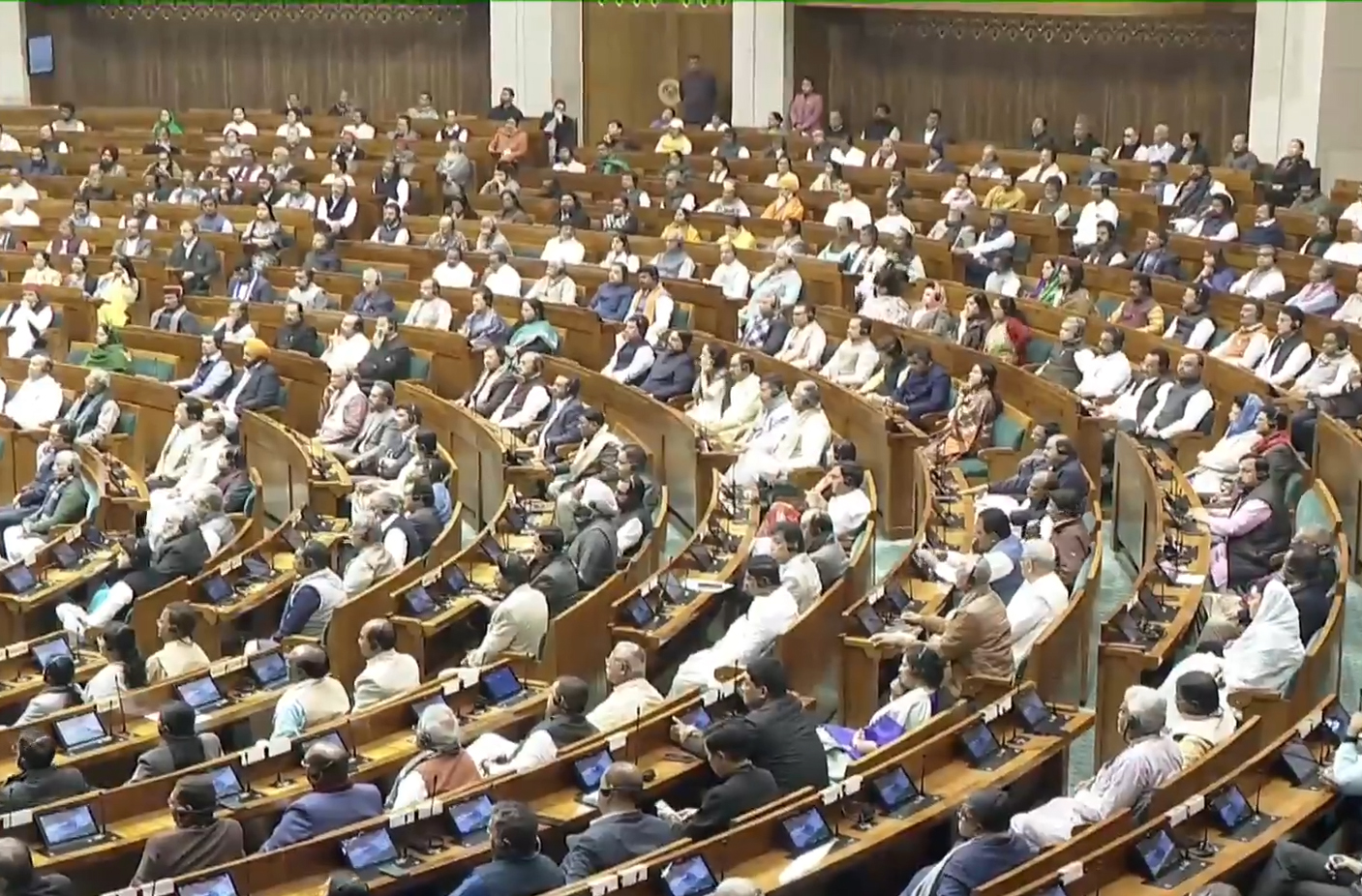 In her address, the President said the Viksit Bharat – Guarantee for Rozgar and Ajeevika Mission (Gramin) (VB-G RAM G) would provide guarantee for 125 days of work, and would also stop corruption and leakages. She also asserted that it would provide a new impetus to rural development. While the President’s mention of the VB-G RAM G Act was welcomed by treasury benches by thumping of desks, Opposition members raised slogans demanding roll back of the law. President Murmu paused during her address as the opposition raised slogans like “vapas lo” (roll back the Act).
