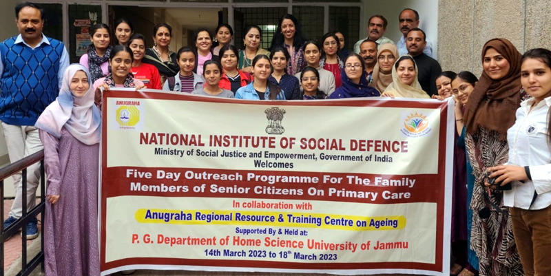 Excelsior Correspondent JAMMU, Mar 19: Five-day outreach programme for youth on `Primary Health Care for Senior Citizens ‘ concluded today at Jammu University. The programme was organized by the National Institute of Social Defence, Ministry of Social Justice and Empowerment in collaboration with ANUGRAHA Regional Resource Centre and Training Centre on Ageing and Department of Home Science, JU. It was aimed to create awareness and educate youth on the importance of primary healthcare for the elderly. Speaking in the valedictory session, Dr Aabha Choudhary, Chairperson of ANUGRAHA Regional Resource and Training Centre on Ageing, stressed that keeping silent in cases of victimization of senior citizens by their own family members is not the solution but taking appropriate steps by the neighbourhood families and youth in rescuing the elderly who are at risk of abuse. Societal pressure on such family members can be a major preventive measure in tackling the problem, she added. Earlier, Prof Samridhi Arora, Head, Department of Home Science, JU, and also the coordinator of the programme, presented a brief report and an overview of the lectures delivered during the programme. Some of the main themes covered included Physical Health of the elderly, Cognitive Functioning of the Aged, Bridging the Generation Gap, Successful Ageing, Medico-Legal Perspective to ageing, Nutritional Needs of the Elderly Population Ageing- A Reality Check, Status, policies and programmes, Osteoporosis and pain management, Geriatric care, Legal Perspective related to Medical Negligence of Senior Citizens. A distinguished group of healthcare professionals and experts shared their knowledge and expertise on primary healthcare for the elderly. Some of the prominent speakers and resource persons include Prof Rajni Dhingra, Prof Neeru Sharma, Prof Shashi Manhas, Prof Samridhi Arora from the Department of Home Science, JU, Dr Nirojini Bhat, former Visiting Faculty in Food & Nutrition, Dr Rohit Bhatia, renowned Physiotherapist and Visiting Consultant, IIT, Jammu, Dr Kamini Sharma, Neurologist, K D Multispeciality Hospital, Jammu and .Deepali Arora, Sr Advocate, J&K High Court Deepali Arora, Sr Advocate in J&K High Court and also State Coordinator of the ANUGRAHA Regional Resource and Training Centre for Ageing, apprised the audience about the relevance of the programme in developing sensitivity towards senior citizens. The programme was assisted by Dr Charu Mohan, Sr Scientist, Department of Home Science, JU.
