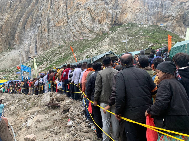 Officials said there is huge rush of pilgrims from both the tracks coming daily for darshan of naturally formed Ice Lingam. The long queues of pilgrims were seen at holy cave waiting for darshan as well as base camps of Nunwan -Pahalgam in Anantnag district of South Kashmir and Baltal in Central Kashmir of Ganderbal district. Huge queues of pilgrims were also seen at Panchtarni, Sheshnag and Chandanwari camps enroute to holy cave in the morning when exit gates were opened and yatris asked to leave for their onwards sojourn.