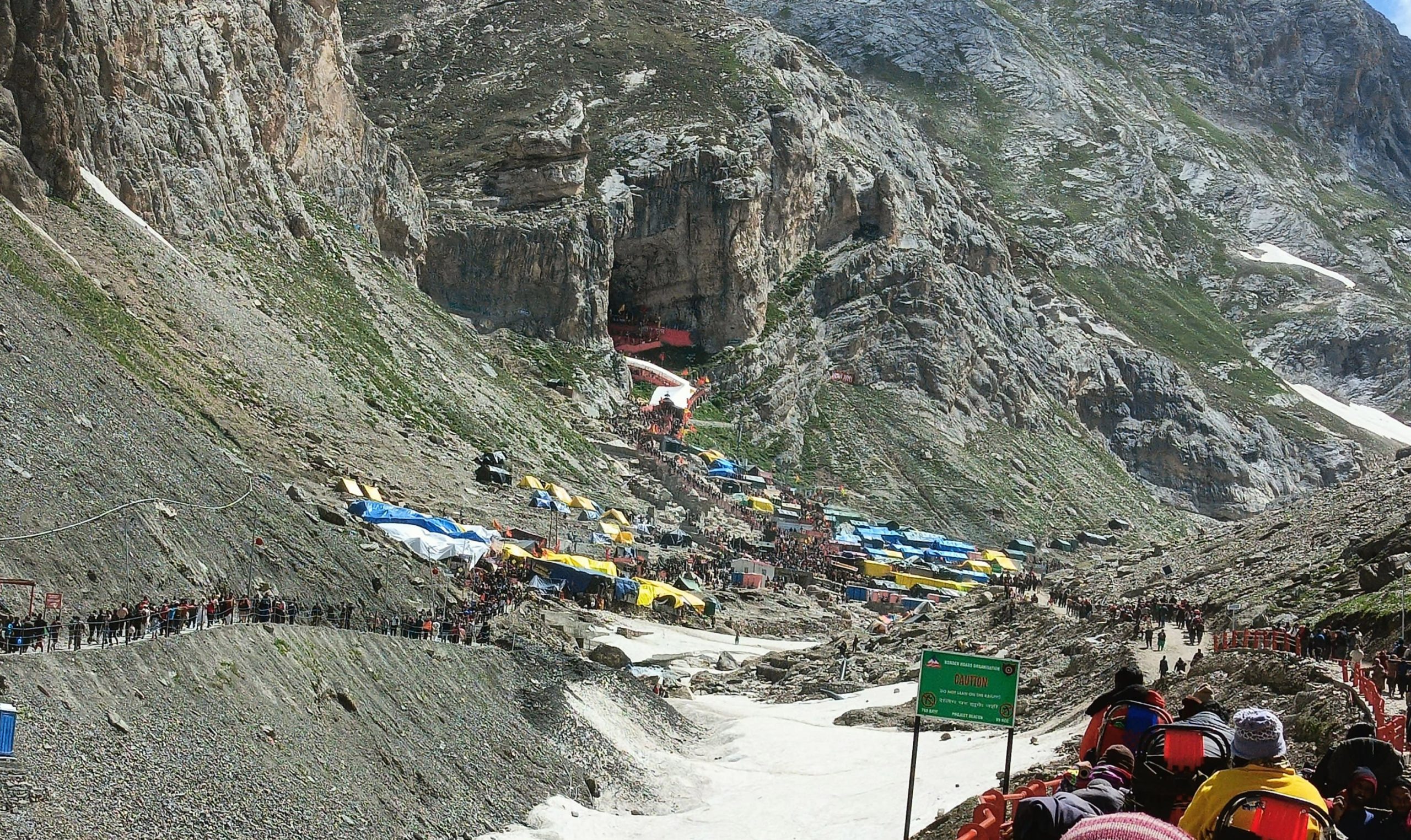 The cave is situated at an altitude of 3,888 metres above sea level in the Kashmir Himalayas. Devotees approach the cave shrine either from the traditional South Kashmir Pahalgam route or the North Kashmir Baltal route.