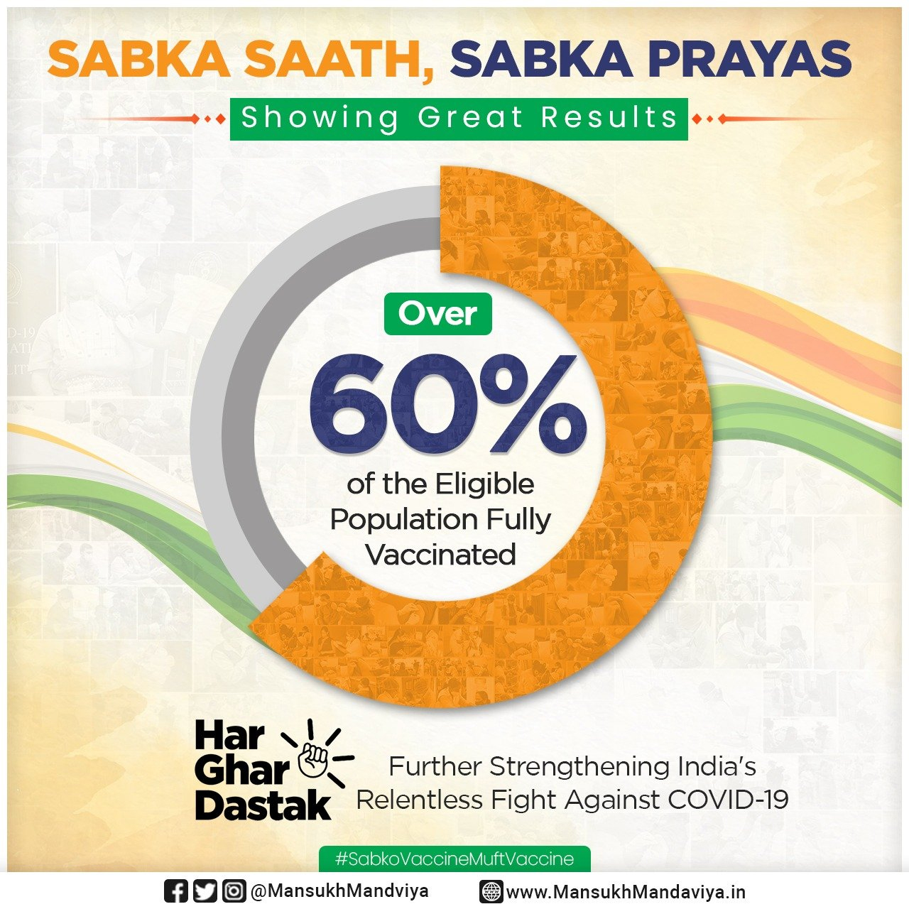 Taking to Twitter, the Ministry said, “Accomplishing more new feats! Congratulations India. Aided by public participation & dedicated efforts of our health workers, over 60 per cent of the eligible population fully vaccinated now.”