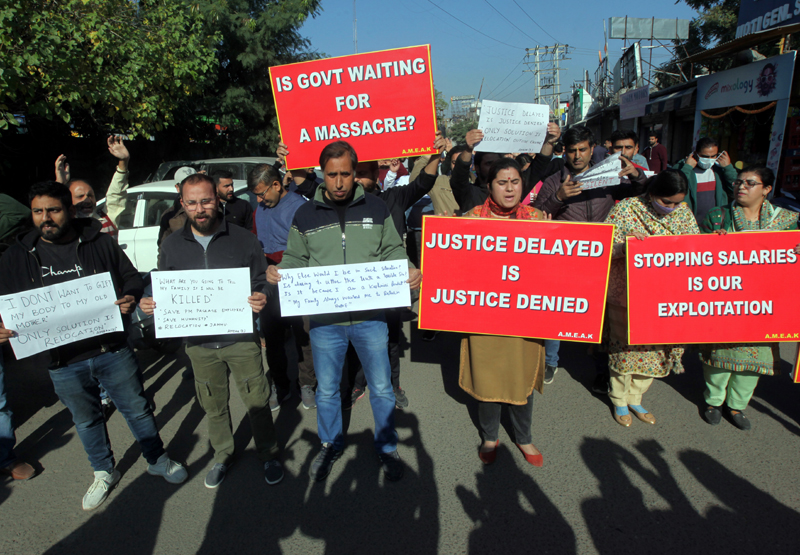 JAMMU, Dec 13: Accusing the UT Government of its failures in mitigating the sufferings of package employees, All Migrant Employees Association Kashmir (AMEAK) staged a strong demonstration in front of Press Club here in support of their demand of relocation and releasing of salaries.