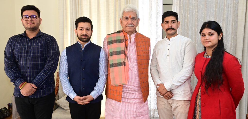 Youth from J&K including Yuvraj Singh, Dr Sandeep Sharma, Vansh Mahajan and Mannat Sharma, who will represent Jammu Kashmir at the World Youth Festival called on the Lt Governor.