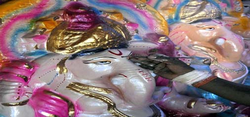 A painter gives final touch to the idol of Lord Ganesha on the eve of Ganesh Chaturthi in Jammu on Thursday. -Excelsior/Rakesh
