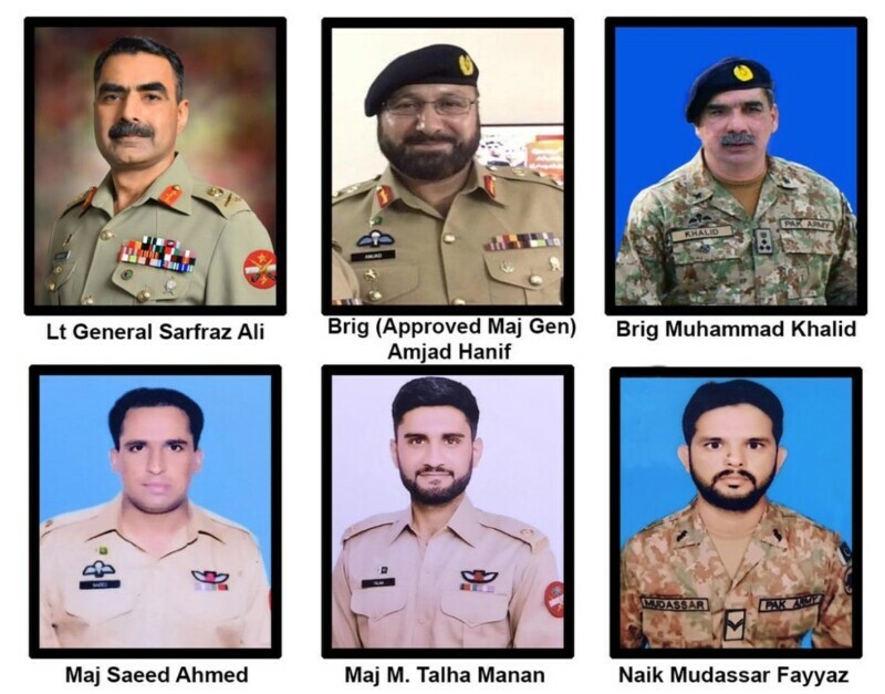 The six individuals on board included the Commander XII Corps Lt Gen Sarfraz Ali, who was supervising the flood relief operations in Balochistan province.