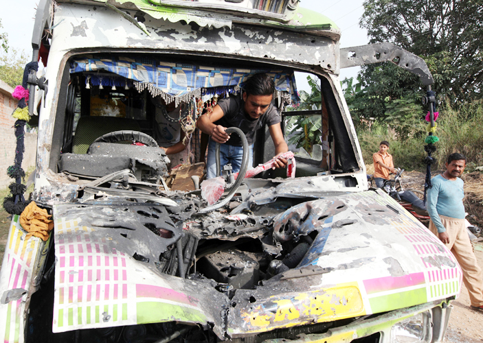 Two mortar shells fell inside New Modern Higher Secondary School at Mawa, damaging the school bus parked inside the premises and portion of the building. However, no one was present inside the school. Several vehicles parked at village Mawa including a matador, tractor-trolley, some bikes etc were also hit by the splinters, damaging them extensively.