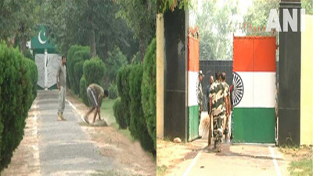 Pakistan Rangers clean their posts after seeing BSF jawans at R S Pura tidying up their posts at Octroi in Suchetgarh Sector.