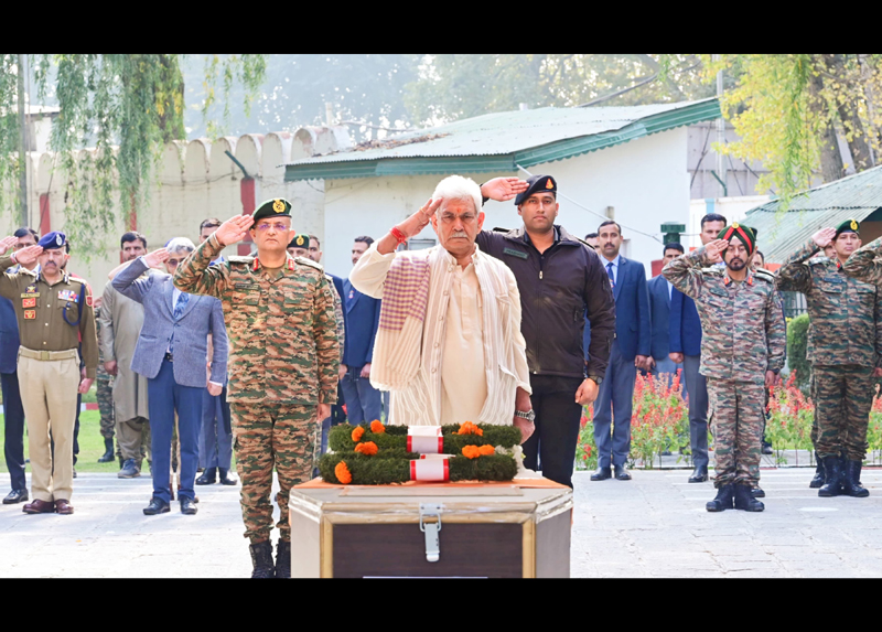 LG Manoj Sinha paying homage to martyred Army personnel in Srinagar on Friday.