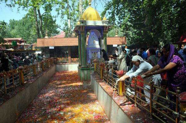 TULMULLA, GANDERBAL, June 6: Thousands of Kashmiri Pandits from different parts of the country today thronged to the shrine of Goddess Ragnia Devi to celebrate the annual Kheer Bhawani mela at Tulmulla in Central Kashmir district of Ganderbal.