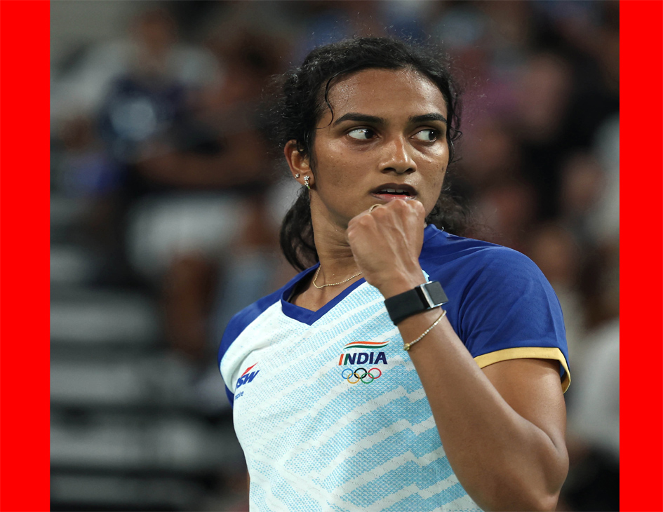 PARIS, Aug. 2, 2024 (UNI/Xinhua) — Pusarla V. Sindhu of India reacts during the badminton women’s singles round of 16 match against He Bingjiao of China at the Paris 2024 Olympic Games in Paris, France, Aug. 1, 2024. UNI