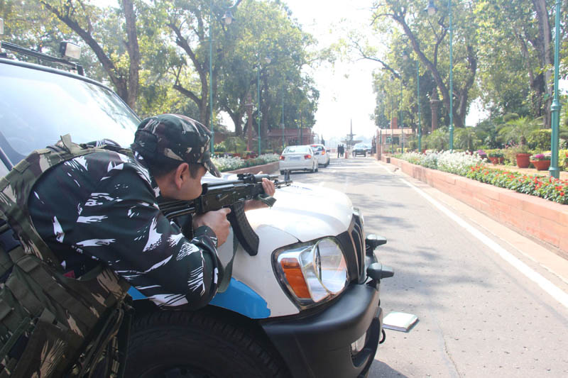 Pictures taken during the incident show troops of CRPF’s Parliament Duty Group taking offensive positions behind an armoured vehicle that blocked the road that leads up to the main parliament complex.