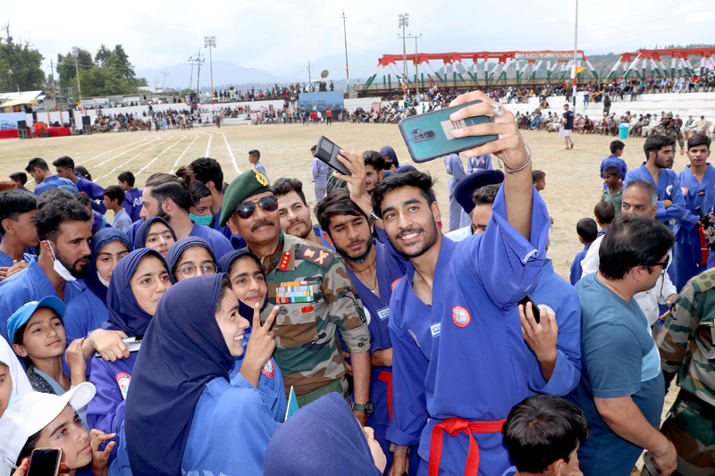 Participants of Sports Festival taking selfie with GOC, Lieutenant General DP Pandey at Shopian on Tuesday.