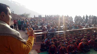 MLA R S Pathania addressing public meeting in remote area of Ramnagar.
