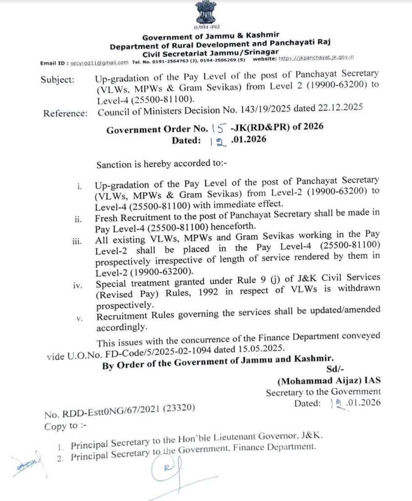 JAMMU, Jan 12: The Jammu and Kashmir Government has approved the up-gradation of the pay level of Panchayat Secretaries, including Village Level Workers, Multipurpose Workers and Gram Sevikas, from Level 2 to Level 4 with immediate effect.