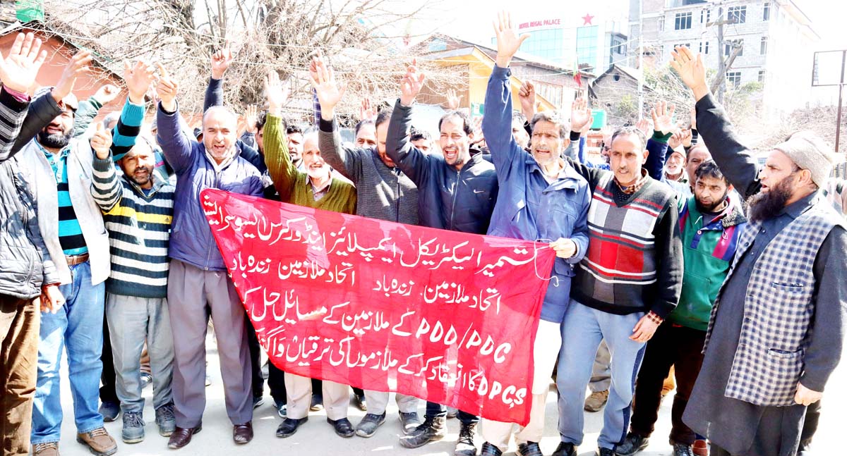 PDC employees protesting in Srinagar on Monday. -Excelsior/Shakeel