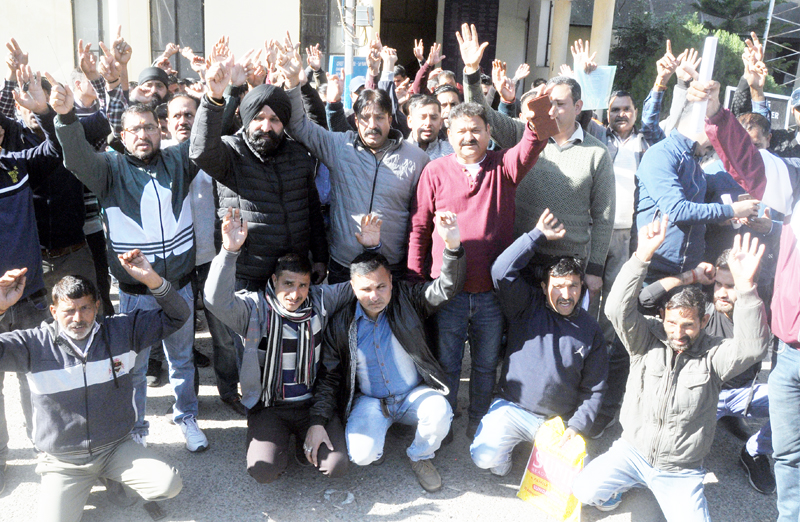 PDL/TDL employees staging protest in Jammu on Monday. -Excelsior/Rakesh