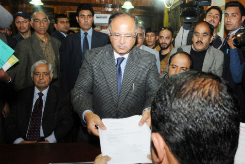 PDP leader, Tariq Hamid Qarra, flanked by the party patron Mufti Mohammad Sayeed filing his nomination papers for Srinagar Lok Sabha constituency on Wednesday.
