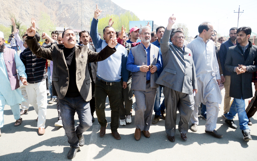 PDP leaders protesting against ban on civilian traffic movement on NH at Srinagar Bypass.— Excelsior/Shakeel