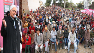 PDP patron Mufti Mohd Sayeed addressing a public meeting in Suchetgarh on Sunday.