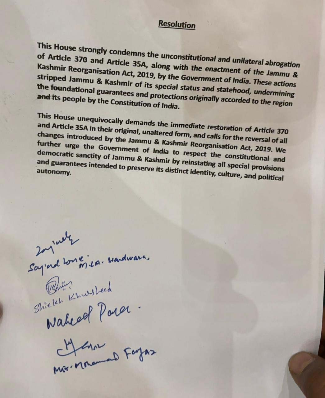 The resolution was submitted by PDP members Waheed Para (MLA Pulwama) and Fayaz Mir (MLA Kupwara), Peoples’ Conference MLA from Handwara Sajad Lone, Awami Ittehad Party MLA from Langate Sheikh Khursheed (brother of MP Sheikh Abdul Rashid alias Engineer Rashid), and independent MLA from Shopian Shabir Kullay.