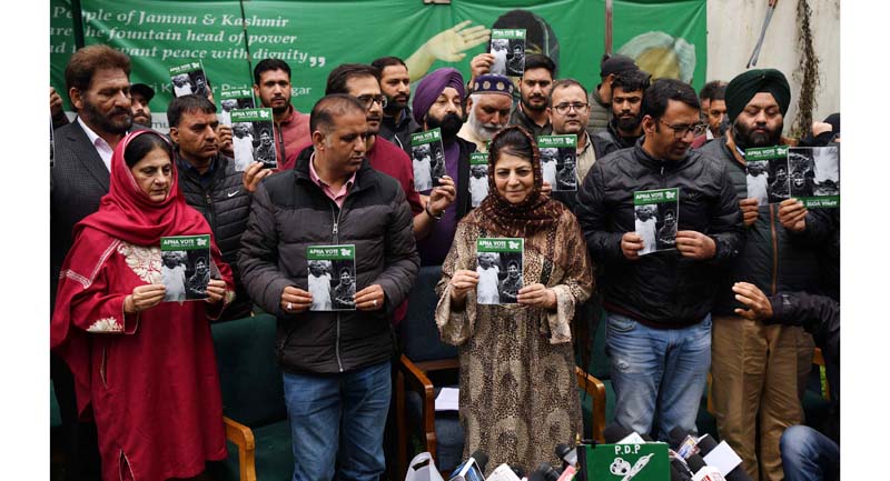 PDP president and other leaders releasing manifesto for the 2024 Lok Sabha elections at party hqrs in Srinagar. -Excelsior/Shakeel By Daily Excelsior - April 20, 2024 Share FacebookTwitterWhatsAppPinterestLinkedinCopy URLTelegramEmailTumblrReddItPrintKoo PDP president and other leaders releasing manifesto for the 2024 Lok Sabha elections at party hqrs in Srinagar. -Excelsior/Shakeel PDP president and other leaders releasing manifesto for the 2024 Lok Sabha elections at party hqrs in Srinagar. -Excelsior/Shakeel Follow our WhatsApp channel