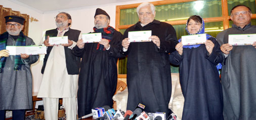 PDP leaders releasing party manifesto in Srinagar on Friday.