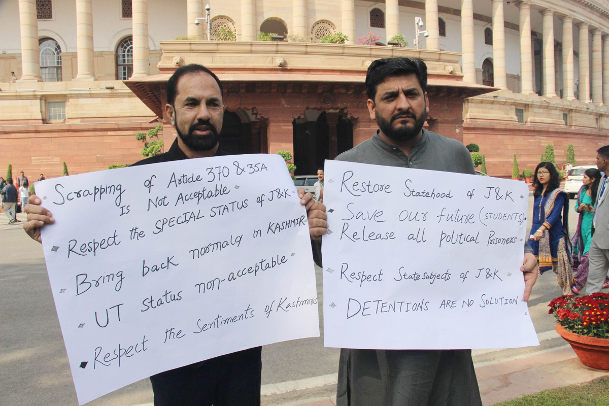 PDP Rajya Sabha members Mir Fayaz and Nazir Ahmed Laway protesting inside the Parliament House premises on Monday. (UNI) By Daily Excelsior - November 19, 2019 Share FacebookTwitterWhatsAppPinterestLinkedinCopy URLTelegramEmailTumblrReddItPrintKoo PDP Rajya Sabha members Mir Fayaz and Nazir Ahmed Laway protesting inside the Parliament House premises on Monday. (UNI) PDP Rajya Sabha members Mir Fayaz and Nazir Ahmed Laway protesting inside the Parliament House premises on Monday. (UNI) Follow our WhatsApp channel