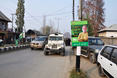 PULWAMA, Nov 20: Violating Model Code of Conduct People’s Democratic Party’s flag strips were found tucked to lampposts and the hoardings of Rajpora candidate for Assembly elections Haseeb Drabu on grills of the divider.