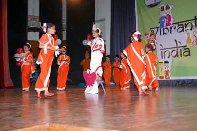 The next item was a group dance where the Punjabi group started chanting the name of Vahe Guru and gave us a glimpse of festivals like Lohri & Baisakhi and even a typical Punjabi wedding. Classy in all aspects came the tiny group of Dogri girls and showcased the bubbly Dogri dance radiated the warmth of vibrant Indian tradition. Cute kids danced in flawless rhythms to the Hindi music which proved to be a blend of cosmic tune. Maharashtra group dance took a peek at the audience followed soon by loud cheers. Gujarati dance had a beautiful costumes which displayed ghumar and garba.