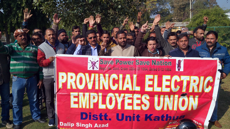 KATHUA, Dec 26: Demanding payment of long pending wages of casual and need based workers, Provincial Electrical Employees Union (PEEU) under the chairmanship of P.C Sharma, its provincial president held a demonstration in front of Deputy Commissioner’s Office here , today.