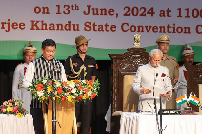 Mr. Khandu, the MLA of Mukto, was sworn in by Governor KT Parnaik in the presence of Union Home Minister Amit Shah, BJP president JP Nadda, Assam Chief Minister Himanta Biswa Sarma and Sikkim Chief Minister Prem Singh Tamang, among others.