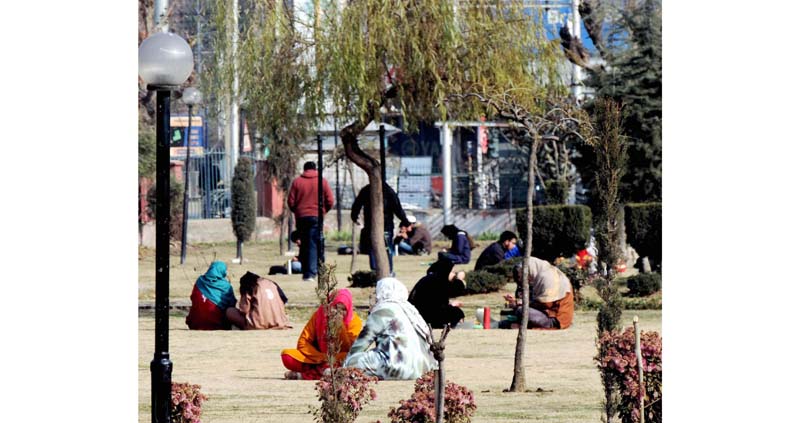 People basking in the Sun at a park in Srinagar on Monday. (UNI) By Daily Excelsior - December 13, 2022 Share FacebookTwitterWhatsAppPinterestLinkedinCopy URLTelegramEmailTumblrReddItPrintKoo People basking in the Sun at a park in Srinagar on Monday. (UNI) People basking in the Sun at a park in Srinagar on Monday. (UNI) Follow our WhatsApp channel