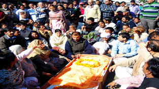 The protestors including sizable number of women carrying dead body of PHE worker squatted at Main Stop Janipur and shouted slogans against the department. Wailing and sobbing the protestors were demanding compensation for the family and Government job to the next kin of Mr Gupta besides payment of his all pending dues.