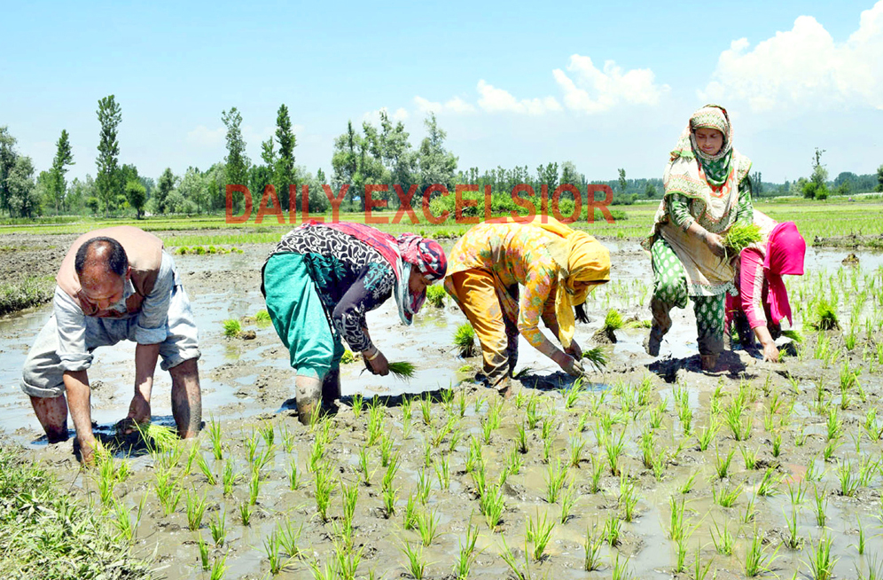 People busy in planting paddy saplings at Kowsibagh in Pulwama district. -Excelsior/Younis Khaliq