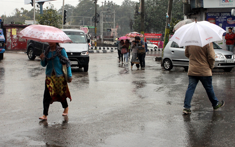 People holding umbrellas move through Jammu roads on rainy Monday. -Excelsior/Rakesh