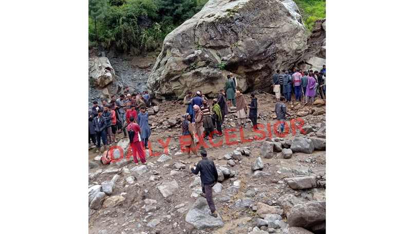 People launch rescue operation after three villagers and cattle came under boulder due to landslides in Mahore. —Excelsior/Romesh Mengi