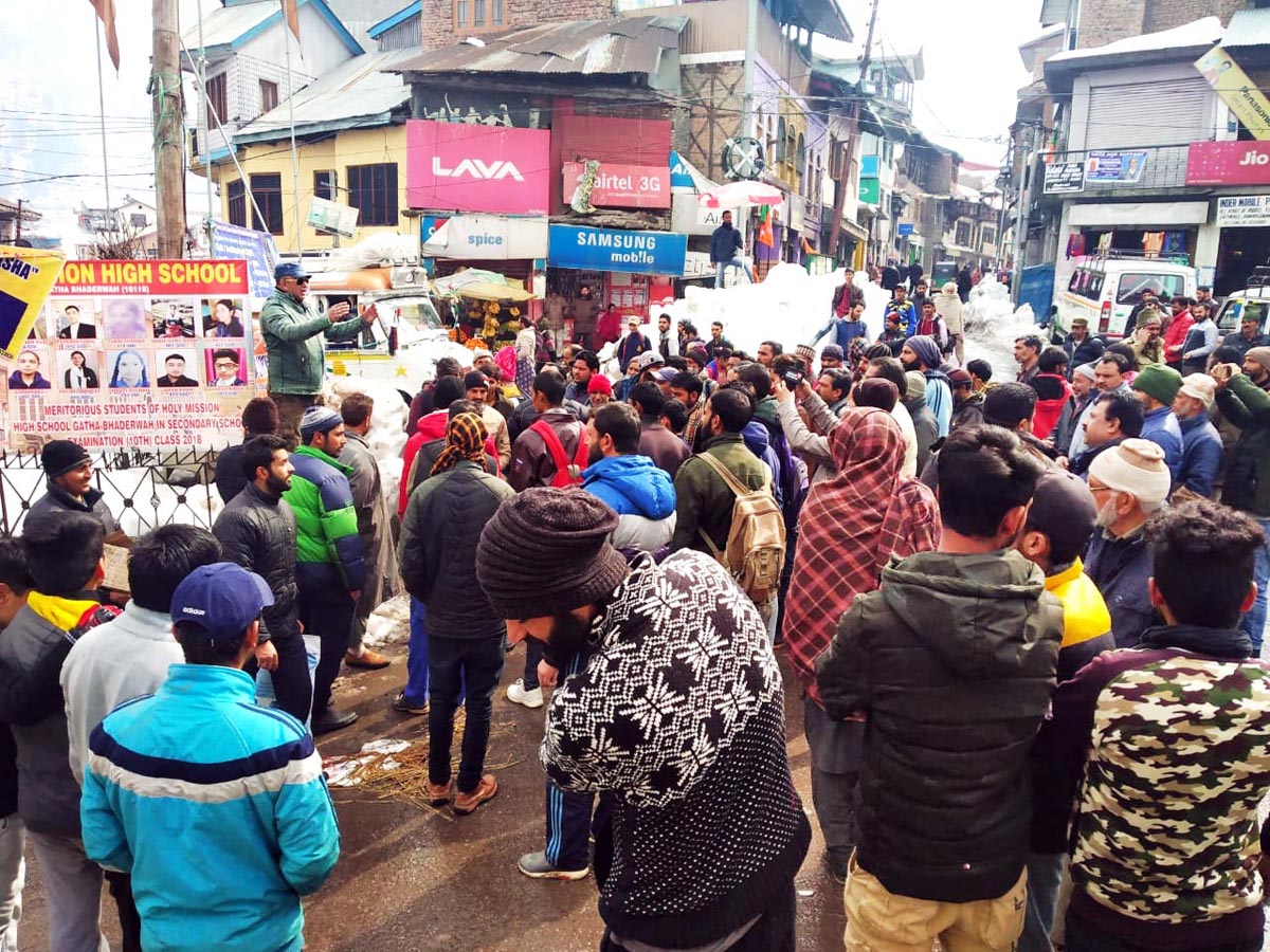 BHADERWAH, Feb 13: Hundreds of people staged a protest Wednesday against the alleged failure of the administration to restore power supply in Bhaderwah town of Doda district.