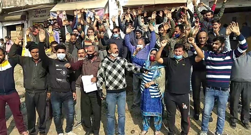 The protest was led by local leader Raj Khajuria and Naib Sarpanch Kishori Lal. They said that due to further widening of Jammu Pathankot National Highway at Jatwal Bus Stand, about 200 shops on both sides of the road will be demolished due to which business will come to an end.