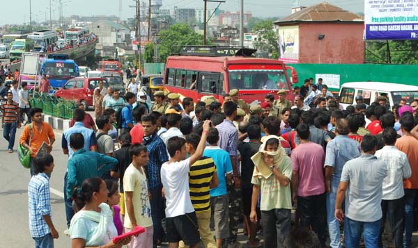 People protesting at Tawi bridge in Jammu on Tuesday.     -Excelsior/Rakesh