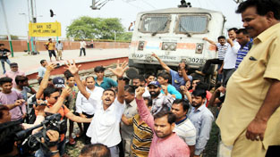 People raising slogans after stopping train at Jammu Railway Station on Tuesday. -Excelsior/Rakesh By Daily Excelsior - June 5, 2018 Share FacebookTwitterWhatsAppPinterestLinkedinCopy URLTelegramEmailTumblrReddItPrintKoo People raising slogans after stopping train at Jammu Railway Station on Tuesday. -Excelsior/Rakesh Follow our WhatsApp channel