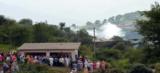 People rush towards a concrete place to take shelter as mortar shell explodes at Balakote on Sunday.