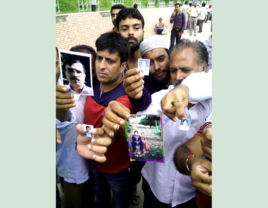 People showing photograph of their family members, who are trapped in Srinagar, outside Technical Airport at Jammu. -Excelsior/Rakesh