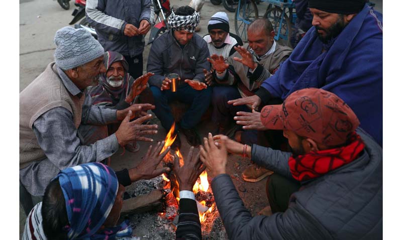 People sitting around a bonfire to warm themselves on the outskirts of Jammu. -Excelsior/Rakesh