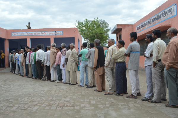 People standing in queue waiting for their turn to cast vote at polling booth in village Chhan Lal Din near border. —Excelsior/Madan Magotra